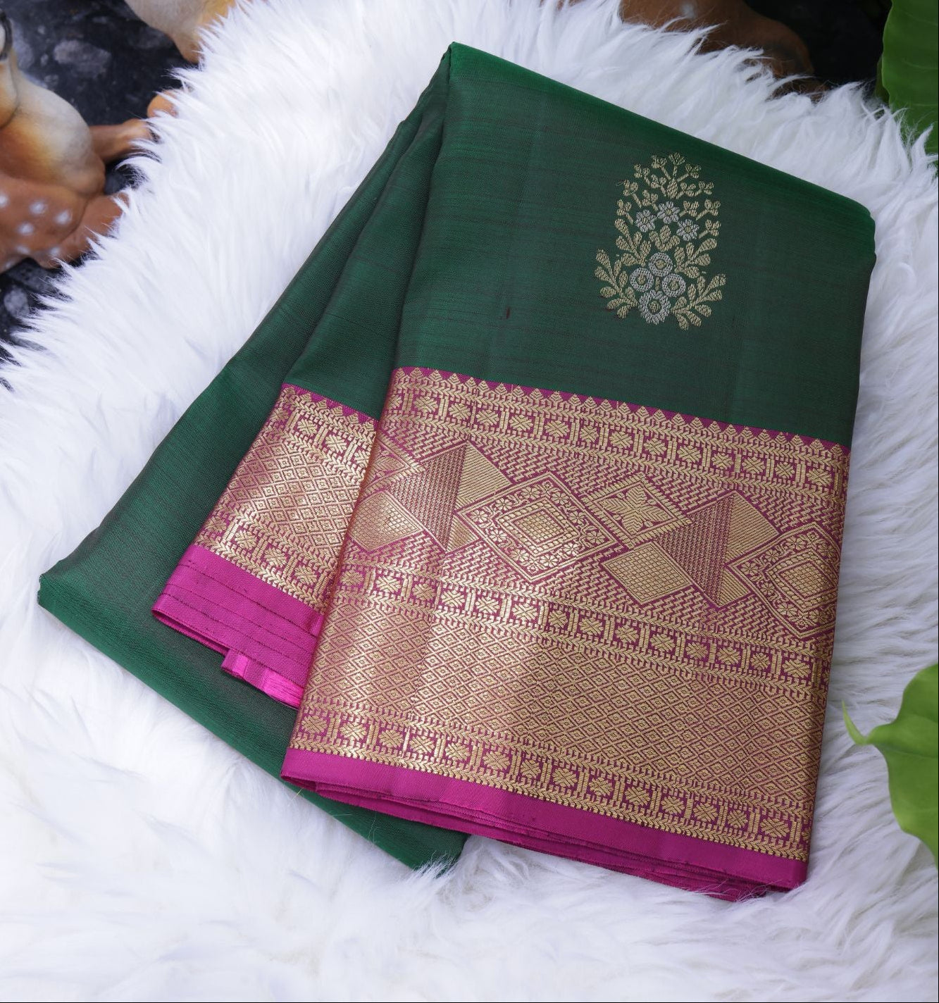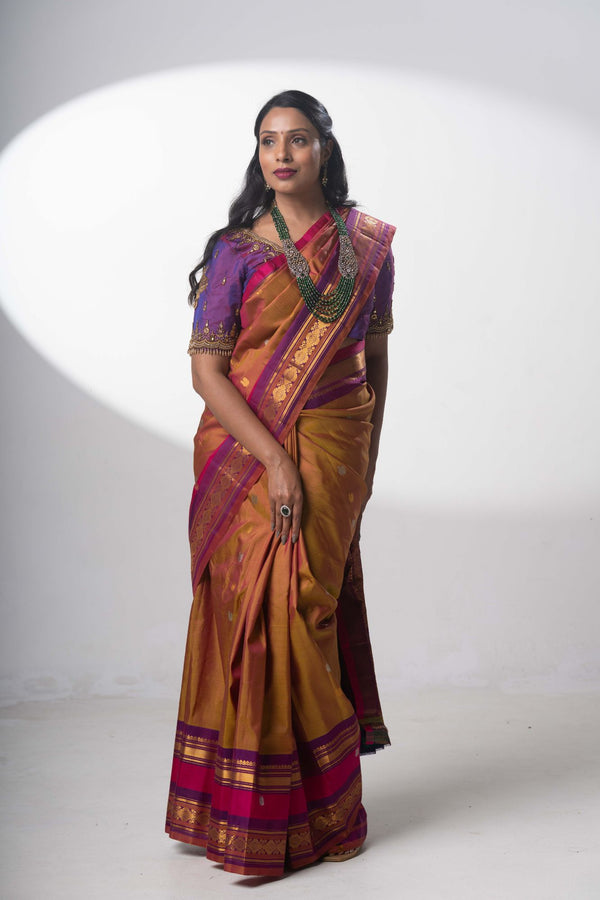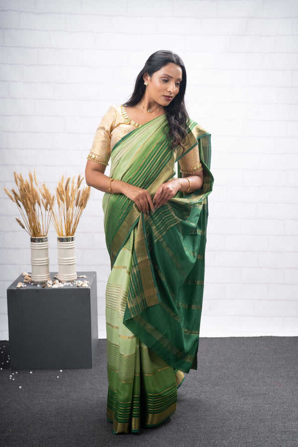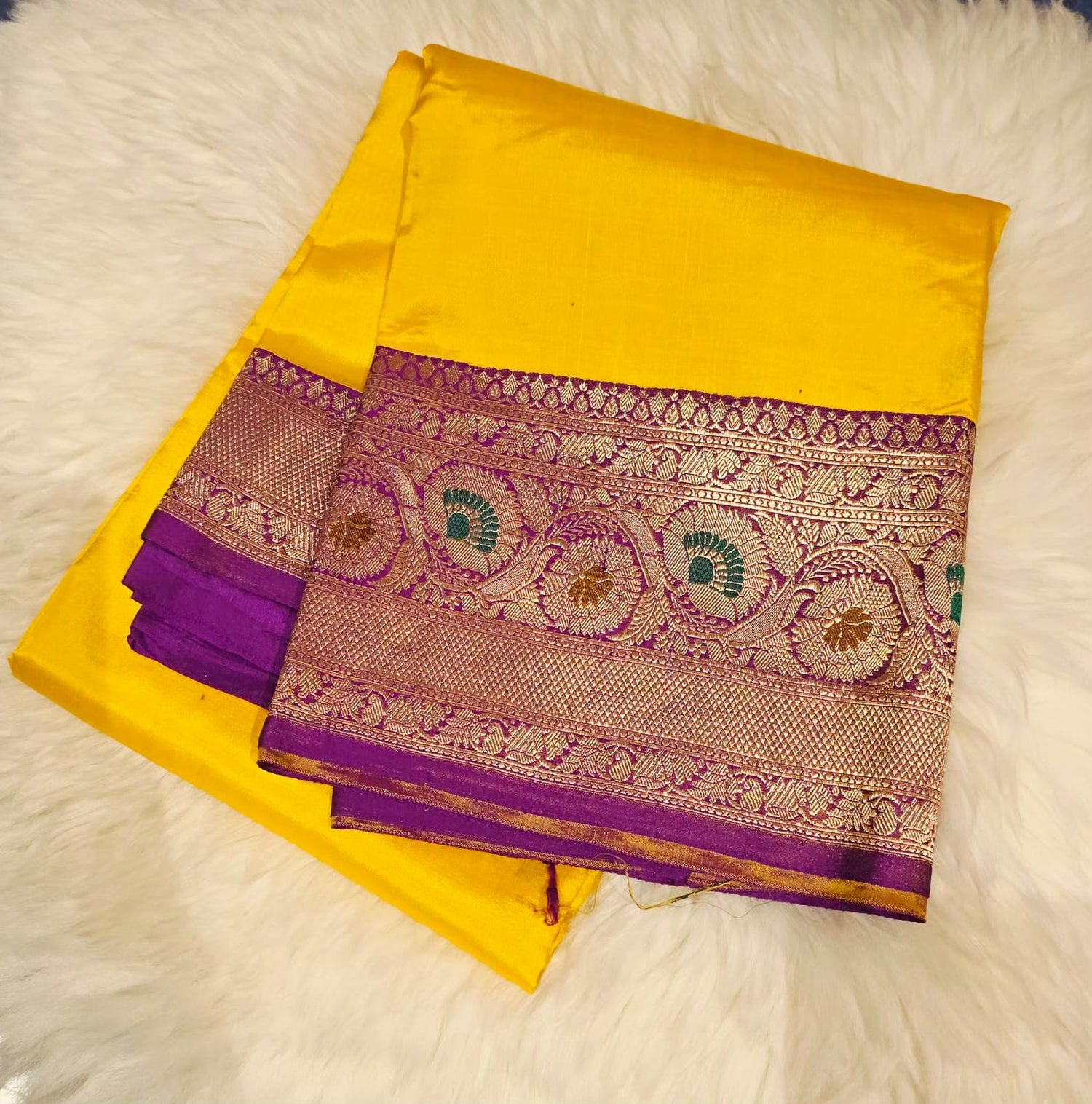 A timeless blend of elegance and tradition, woven with pure silk and enriched with a soft crepe texture. Renowned for its graceful drape, rich sheen, and vibrant hues, this saree embodies royal craftsmanship from Mysore.
