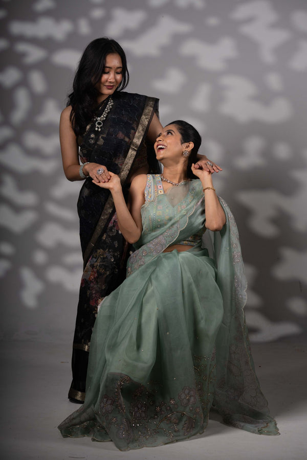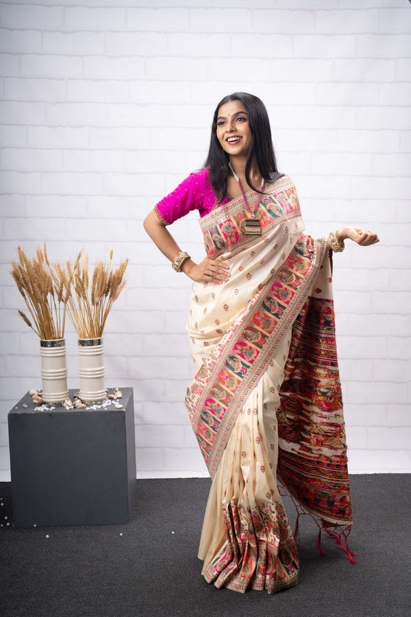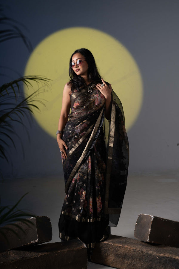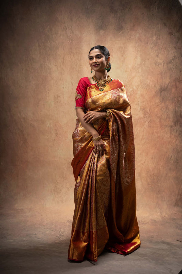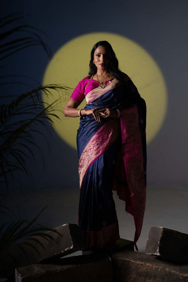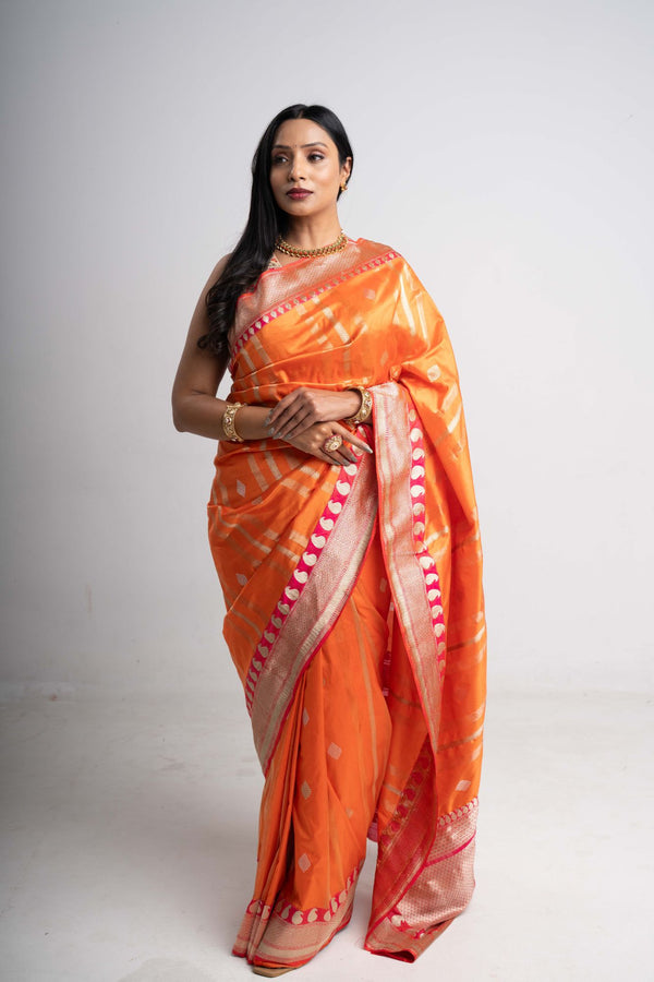 A symbol of timeless elegance, handwoven in Varanasi with luxurious silk and intricate zari work. Adorned with traditional motifs and rich patterns, each saree reflects the grandeur of Indian craftsmanship and royal heritage.