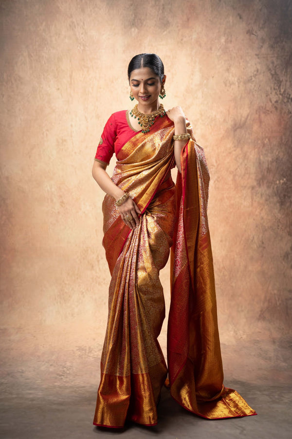 Woven with pure mulberry silk and intricate zari work, each saree reflects the rich weaving heritage of Kanchipuram. Renowned for its durability, luster, and traditional motifs, this saree is a perfect blend of luxury and culture, making it ideal for weddings, festive occasions, and grand celebrations.