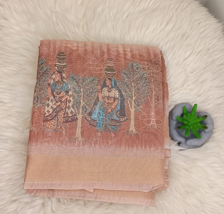 The saree showcases a warm peri-peri peach base beautifully enhanced with heritage-inspired folk artwork, featuring traditional figures and nature motifs in soothing earthy hues. A subtle self-woven border adds a refined finish while keeping the focus on the intricate print.