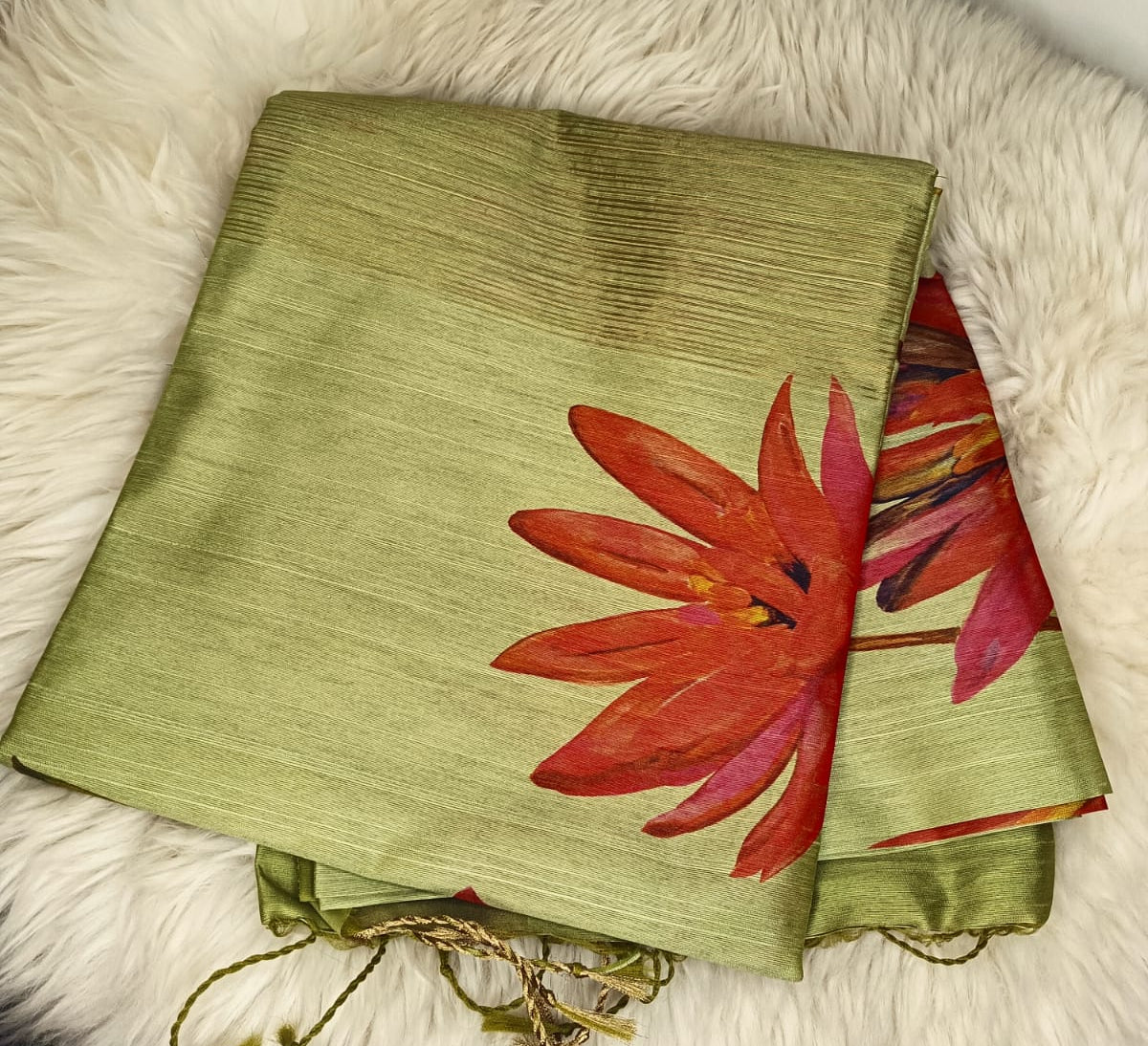 This light green Chanderi digital saree radiates freshness with its bold red-orange floral print and hints of regal purple. The soft, textured weave glows with understated elegance, while golden tassels add a festive flourish. A perfect pick for garden parties, temple visits, or serene celebrations, it’s where nature meets tradition in style.