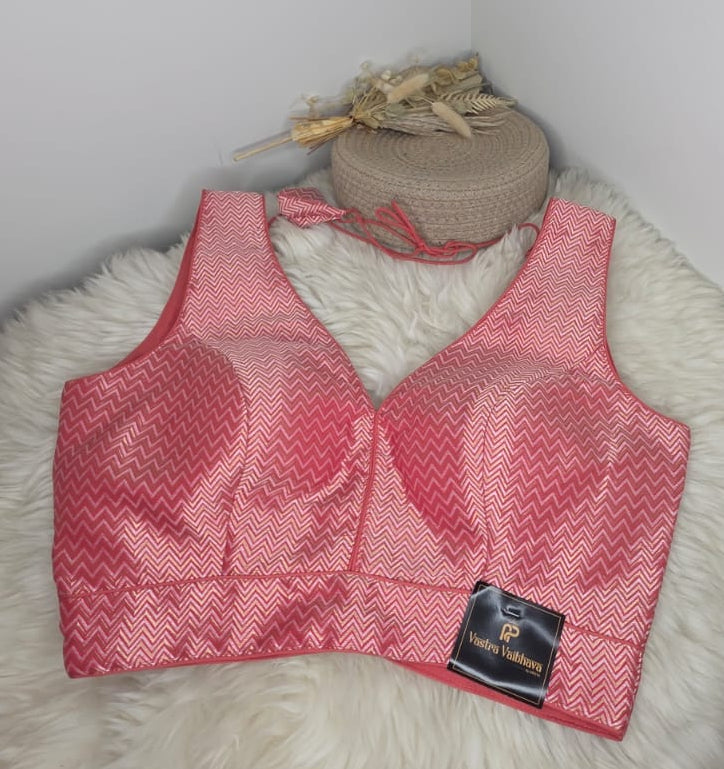 Add a festive sparkle to your saree look with this stunning Pink & Silver Zig-Zag Brocade Readymade Blouse, crafted with rich woven texture and a modern deep V-neck design.