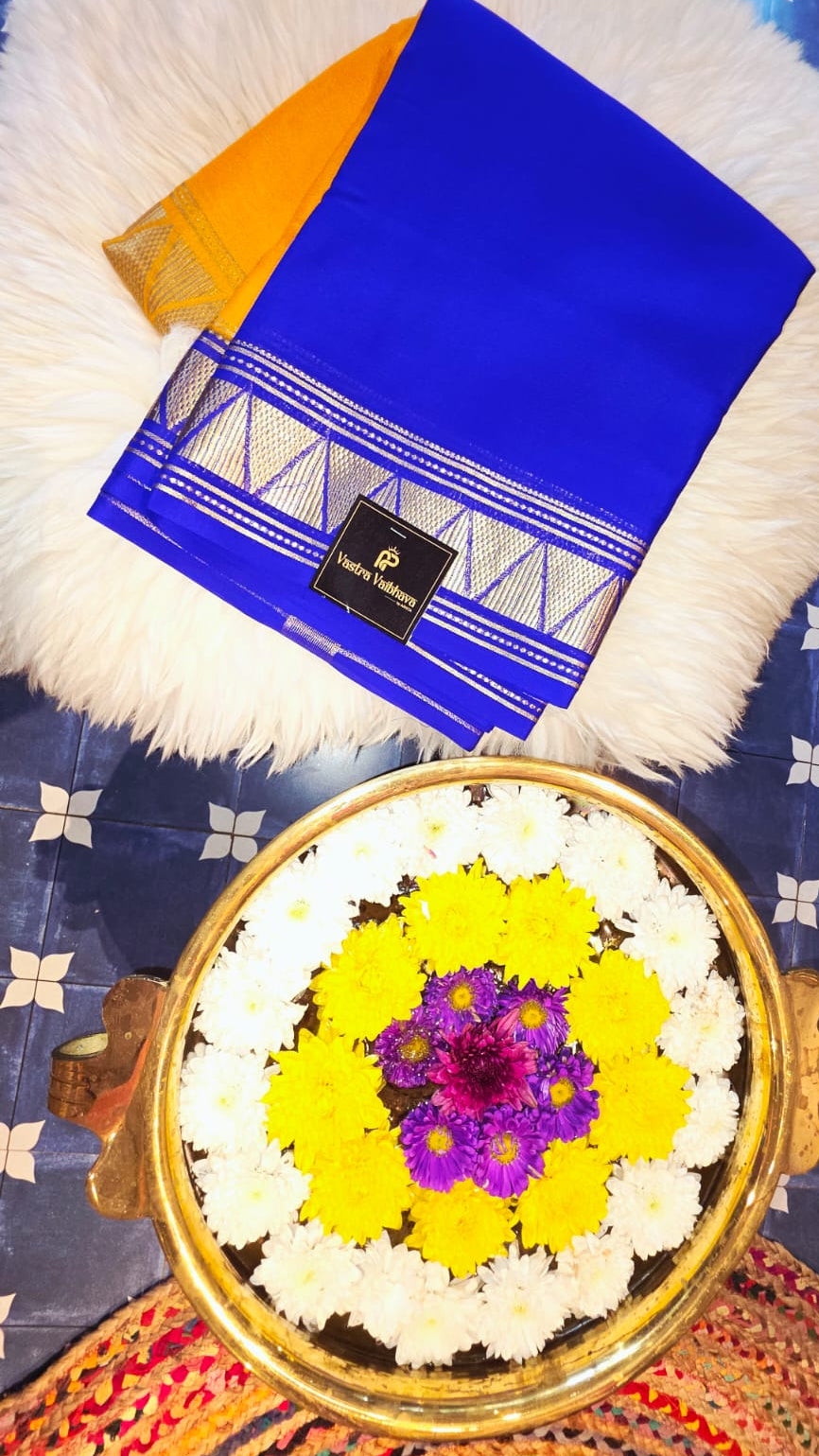 Step into sophistication with this Pure Crepe Mysore Silk Saree, featuring a stunning half-and-half dual colour tone in rich royal blue and mustard yellow. The saree is beautifully detailed with an intricate geometric border design that continues seamlessly through the middle, adding depth and symmetry to its traditional appeal.