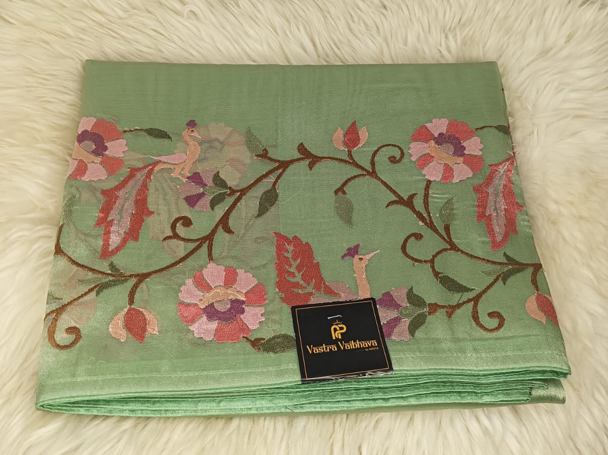 A serene light green Pure Tissue saree, embroidered with graceful birds and blooming florals in pink, purple, and brown. Its sheer elegance and artistic detailing make it a perfect pick for poojas, haldi, or nature-inspired festive mornings.