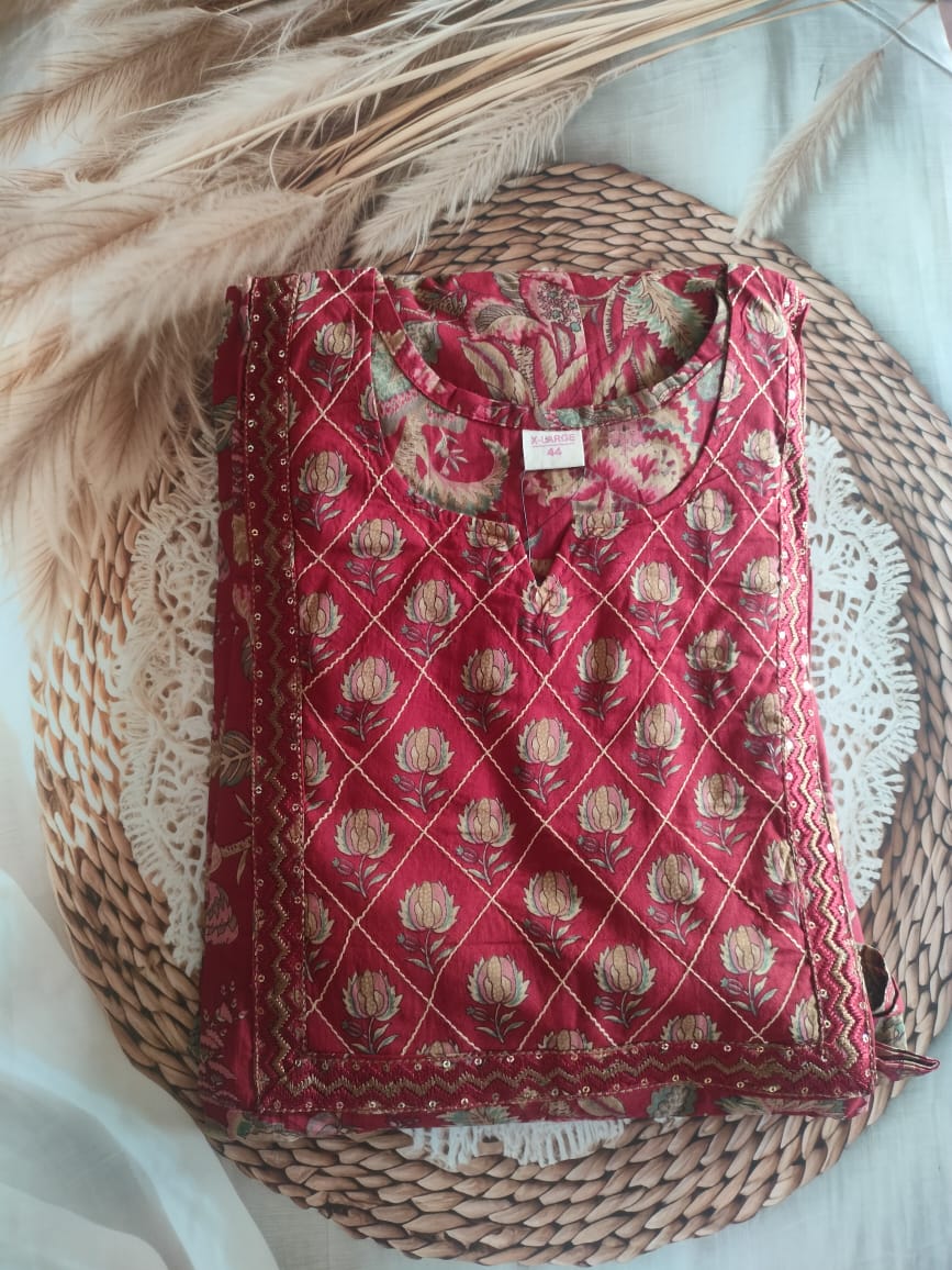 Radiating regal charm, this red Anarkali dress is adorned with intricate lotus and geometric motifs in rich gold tones. Crafted from soft handloom fabric, its flowing silhouette and elegant neckline make it a perfect choice for festive occasions and cultural celebrations. A timeless blend of tradition and grace.