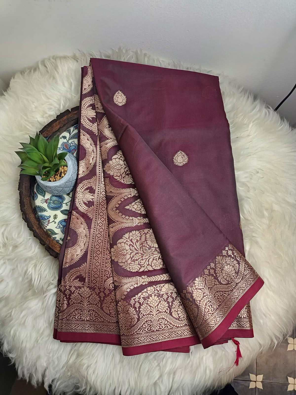 A graceful Semi Banarasi Mashroo saree highlighted with subtle gold buttas and a luxurious woven border. Comfortable yet elegant — ideal for effortless festive styling.