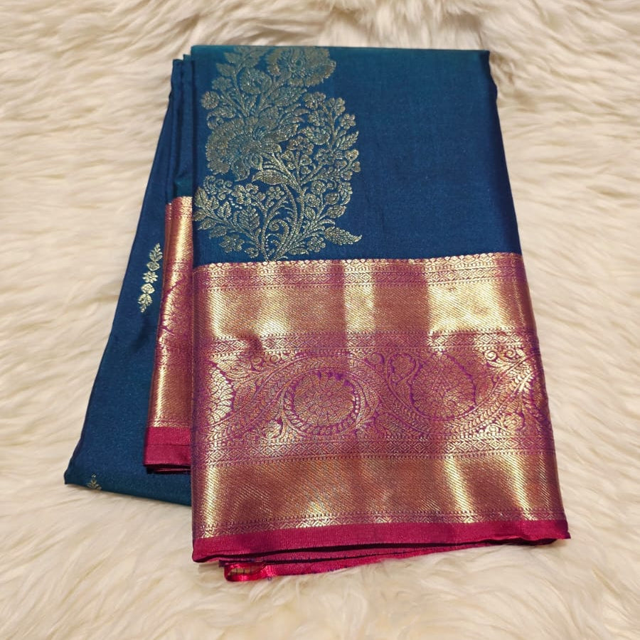 Bring timeless elegance to your festive wardrobe with this Premium Semi Kanchipuram Silk Saree, crafted with rich zari detailing and a luxurious finish. The deep teal-blue body is enhanced with delicate gold zari buttas, giving the saree a graceful and sophisticated look.